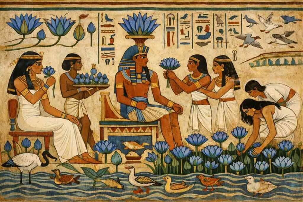 Few images in the entire canon of ancient Egyptian art appear as consistently and deliberately as the blue lotus. Stretched across tomb walls, carved into ceremonial vessels, woven into funerary garlands, and pressed into the hands of painted gods, the blue lotus was not decorative background detail. It was intentional, symbolic, and almost certainly pharmacological. For decades, Egyptologists treated it as a religious emblem and little more. But a closer reading of the tomb paintings, combined with modern botanical analysis of Nymphaea caerulea, tells a far more layered story about how ancient Egyptians understood pleasure, ritual, and the threshold between ordinary consciousness and the divine.